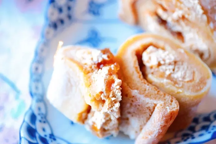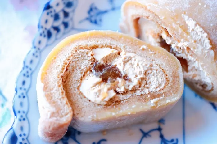 ロールの中央には黒蜜ソースが入っていて、その周りに「桔梗信玄餅どらもっち」と同じ味のきな粉が混ざったクリームが入っていました。黒蜜もきな粉も信玄餅には欠かせない味ですね。