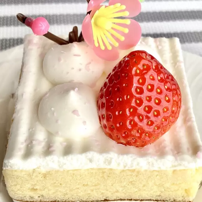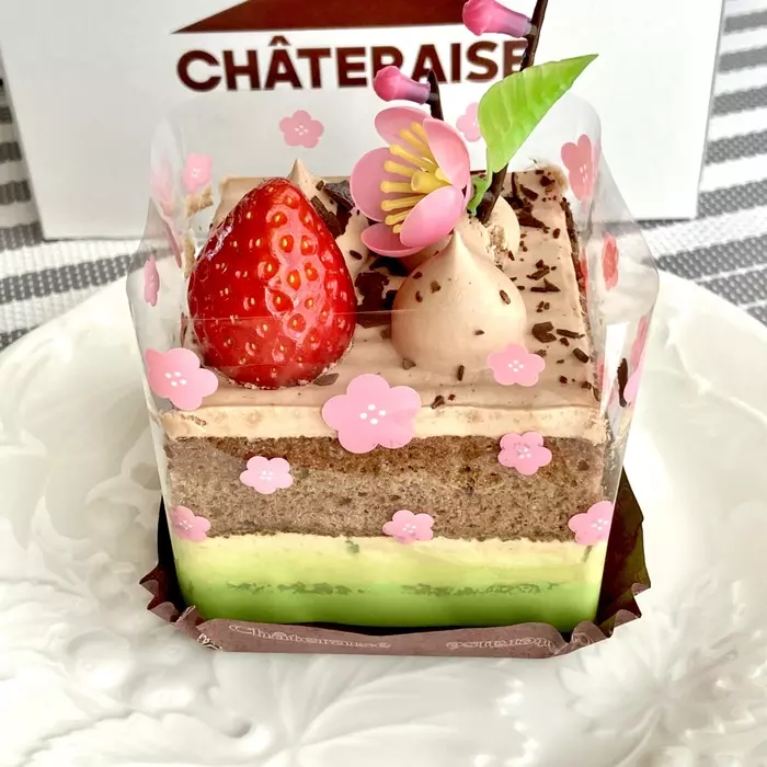 こちらは、前出のショート/チョコショートに比べると、トップのイチゴは2つに増量して、スポンジも上段がいちご味のピンク色、中段がクリームの白、下段が抹茶風味の緑と、ひし餅カラーになり、豪華に!