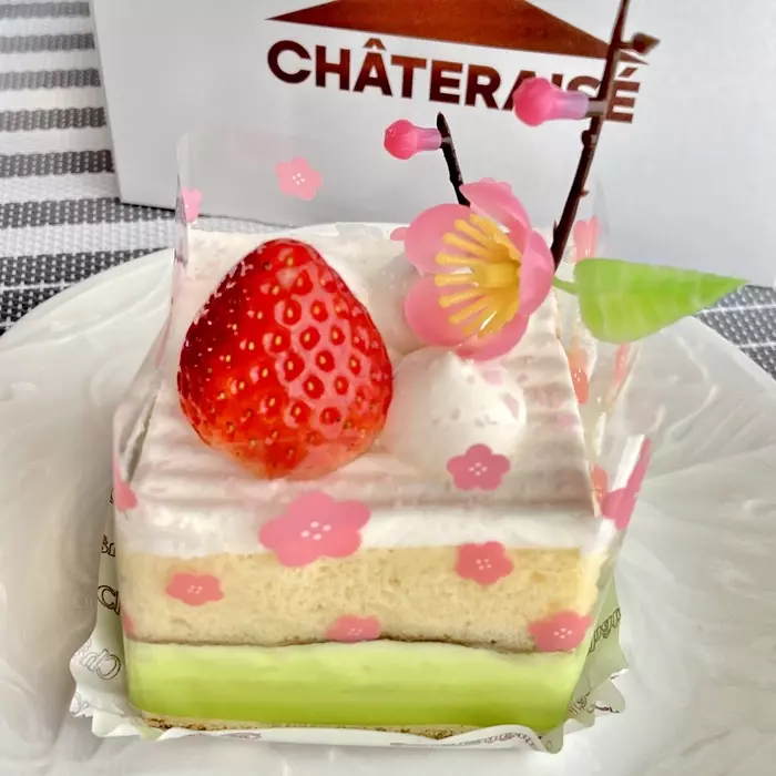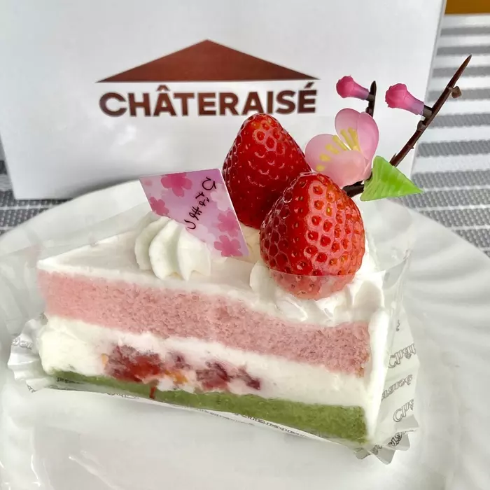 こちらは、前出のショート/チョコショートに比べると、トップのイチゴは2つに増量して、スポンジも上段がいちご味のピンク色、中段がクリームの白、下段が抹茶風味の緑と、ひし餅カラーになり、豪華に!