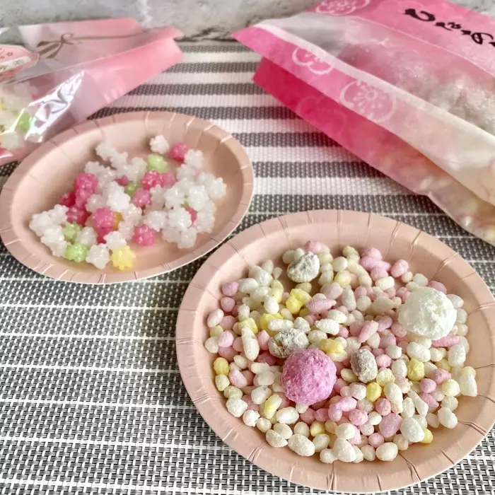 ひなあられには、小さな俵型のあられに、大きな丸型の風船、砂糖をかけた大豆がバランスよく混ぜられ、色や食感に変化があり楽しめます。