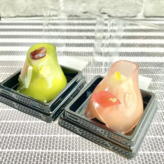 シャトレーゼが自社で炊き上げた餡をお雛様はピンクの、お内裏様は緑の衣で包まれてます。花や花びらの細かい装飾が衣についており、お雛様の扇子には金箔がキラリ。飾っておきたくなる和菓子です!