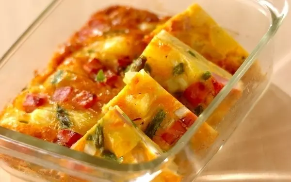 ベーコン・玉ネギ・サヤインゲン・ジャガイモなど具だくさんのオムレツは、カラフルでお弁当の彩りおかずにうってつけです。お花見前日までに具材を炒めておけば、当日の時短調理が叶います。野菜は好きなものでOK。手軽に作るならミックスベジタブルでも良いですよ。