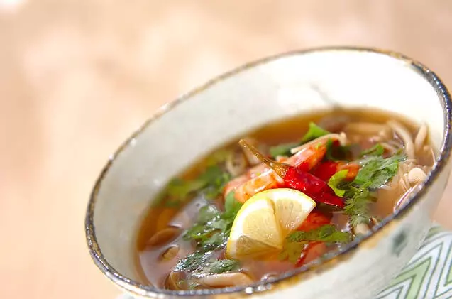 3、鍋に<合わせスープ>を入れて強火にかけ、煮立てば水煮タケノコ、シメジ、白ネギを加える。再び煮立てばエビを入れ、エビの色が赤くなれば火を止める。器に注ぎ、レモンの輪切り、香菜を散らす。