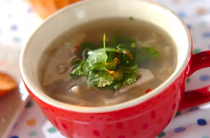 キノコがたっぷり入ったトムヤムクン風のスープです。鍋に材料を入れるだけの「合わせスープ」で作ります。さっぱりした味の中に隠し味に入れた豆板醤とショウガがピリッとアクセントになっています。お好みで春雨を入れてボリュームを出しても◎