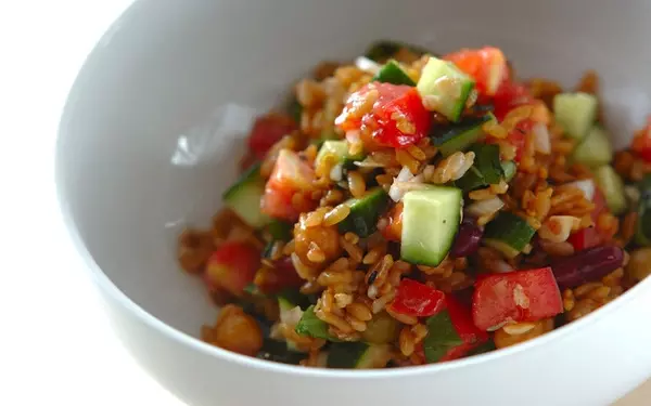 ヴィーガンは野菜のほかに穀物や豆類も取り入れることができます。雑穀入りごはんやミックスビーンズと野菜で作ったサラダは、フレッシュな味わい。ライスサラダが洋風のイメージがあるかもしれませんが、たまりしょうゆで味付けするため和風で親しみやすいです。