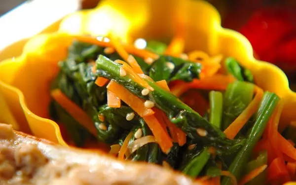 レンジだけで作れる副菜は、忙しいときに便利です。ニンジンはホウレン草と火の通りを均一にするため、細く切ると良いですよ。ゴマ油やガーリックパウダーが食欲を刺激し、ごはんはもちろんお酒も進みます。ラー油でピリ辛にするアレンジもおすすめ。