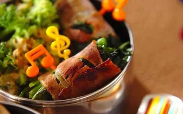 豚バラ肉にスライスチーズとホウレン草をのせてくるくる巻くと、副菜の完成。崩れないように、きつめに巻くのがポイントです。巻き終わりを下にしてフライパンに並べたら、全体にしっかり火を通しましょう。断面がキレイでお弁当がパッと華やかになりますよ。