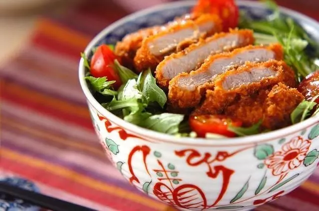 ピリ辛のタレがたっぷりしみ込んだカツは、冷めても美味しくいただけます。ご飯の上に水菜やプチトマトも、ピリ辛ダレとの相性抜群です。ご飯も野菜もトンカツもすすむ味わいです。