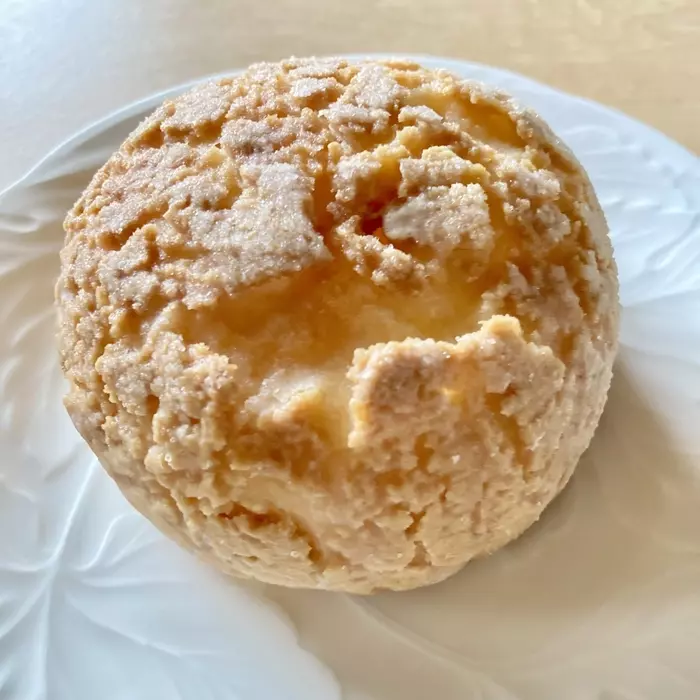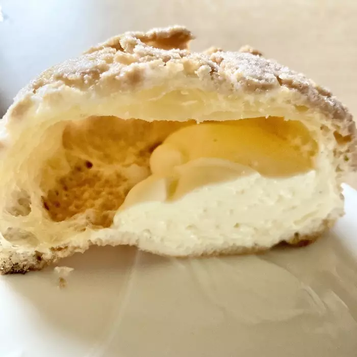 外観はメロンパンぽさが優勢ですが、ビスケット生地の中央には中にクリームを注入したと思しき穴があり、その点はシュークリームらしい・・・。シュークリーム専門店ビアードパパの“クッキーシュー”にとても良く似ています!