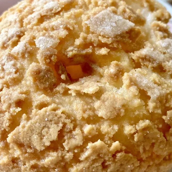 表面はメロンパンの特徴であるビスケット生地で覆われていて、砂糖が全体的にかかっています。裏返してみると、ところどころ砂糖がアイシングのように白く溶けて固まっていて、それがまたとっても美味しそうです。
