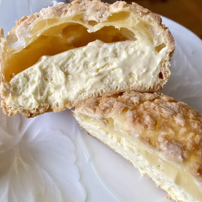 中央に入っているクリームにはところどころバニラビーンズの黒い粒が見え、程よい甘さ。シューの甘さとの組み合わせが絶妙です。大きいけれでも、あれよあれよと食べきってしまい、まさに至福のコンビネーションでした♡
