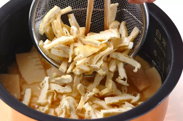 1、炊飯器にお米、<調味料>を入れ、適量線の目盛りまでだし汁を加える。最後に水煮タケノコ、油揚げを加えて普通に炊く。