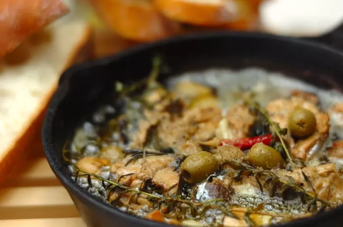 サバ缶はあらかじめ火が通っているからあっという間に完成の、ワインのおつまみに最適なアヒージョです。バゲットを添えて、おもてなしにも。