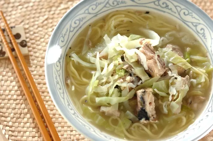 サバの水煮缶を汁ごとスープに使ったラーメンは、サバのダシが効いて旨味たっぷり。昆布茶を隠し味に使うことで味にまとまりと深みが出ています。
