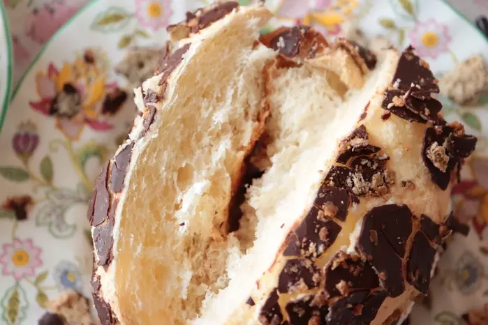 「ブラックモンブランみたいなメロンパン」のメロンパンの外側部分は、チョコレートとクッキークランチでコーティングされているのですが、袋を開けてみると一部分にヒビが・・・!見るからにパリパリしていそうです(笑)。持ち運びには細心の注意が必要だと痛感しました!