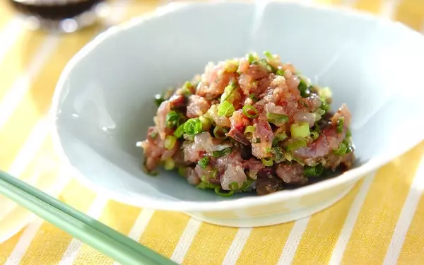 刺身用のアジとみじん切りショウガ、みそを一緒にたたいて混ぜ合わせる「なめろう」。たたきに比べてアジがねっとりと仕上がるのが特徴です。みそは、ほんの少し多めに効かせるとおつまみにぴったりな味に。