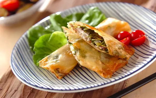 春巻きの具材に刺身用のアジを使うユニークなレシピです。アジには梅肉を塗り、さっぱり仕上げるのがポイント。春巻きの皮がカリッとすればOKなので、短時間で仕上がるのもうれしいですね。
