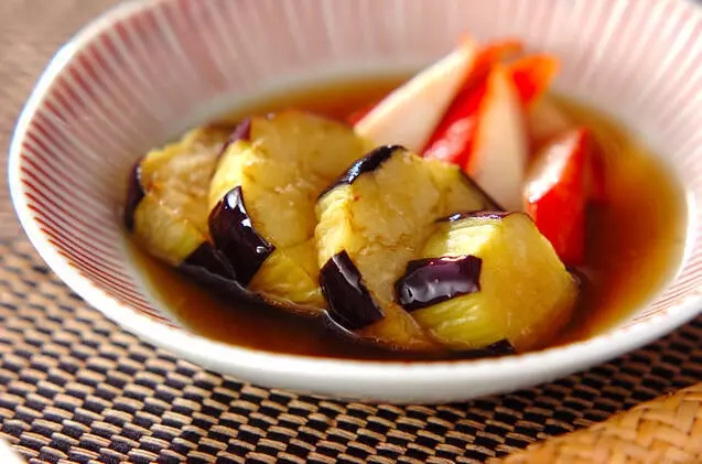 揚げたナスと使い勝手の良いカニカマを、市販の麺つゆにつけ込んで冷やして食べる一品です。米ナスで作る時は、皮をピーラーでむいたあと、半月切りにすると火が通りやすくなります。