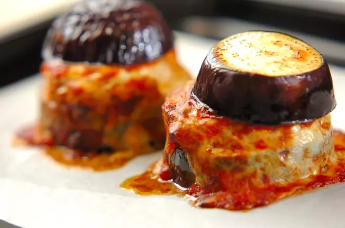 米ナスの厚みをいかした、アイデア光る一品です。ひき肉で作ったパティからあふれる肉汁をナスが吸い込み美味! スライスチーズと市販のミートソースが味の決め手です。トロリとした食感を味わってください。