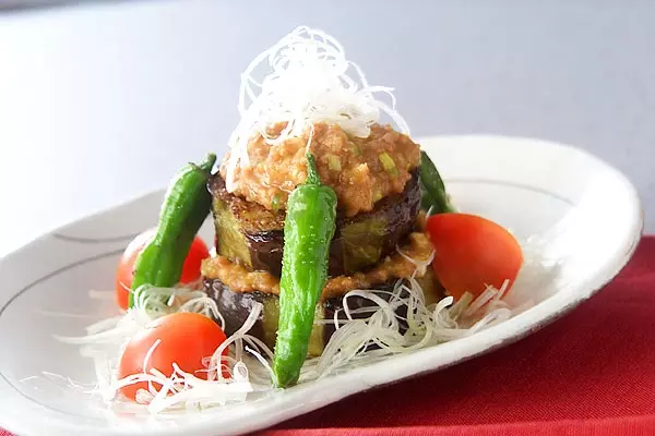 ソテーした米ナスに中華風の肉みそをはさんでステーキ風に仕上げました。ナスは、焼きながら少しずつ油を足して焼くと良いでしょう。ナスに厚みがある場合は、フタをして蒸し焼きにして中まで火を通してくださいね。