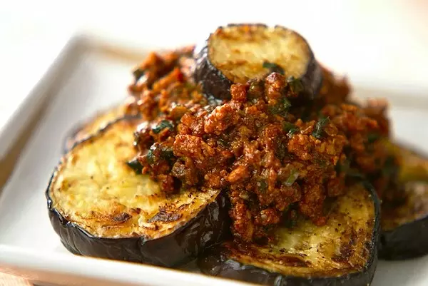 オリーブオイルで焼いた米ナスの上に、鶏ひき肉で作った甘辛味の肉みそを乗せました。片栗粉で肉みそにとろみをつけるのがポイントです。