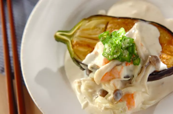 オリーブオイルでじっくり焼いた米ナスに、クリーミーなエビのソースをかけた洋風レシピ。ナスが大きい場合はフタをして蒸し焼きにして下さいね。