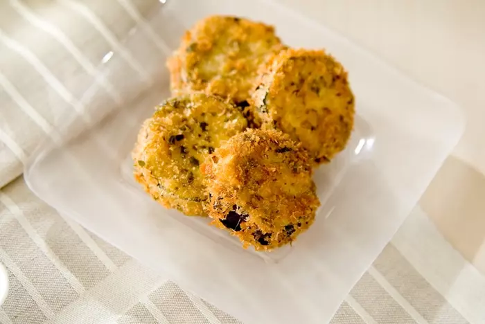 パン粉にドライオレガノを混ぜて揚げたハーブフライです。ローズマリーをプラスしても◎。米ナスはサイズが大きいので輪切りを4等分にすると食べやすくなりますよ。