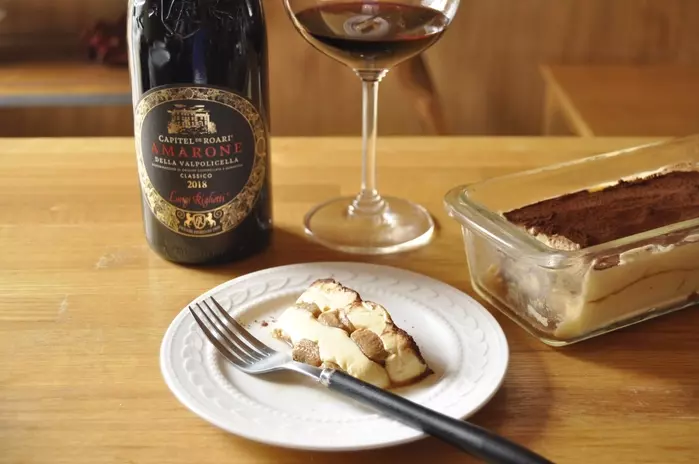 ペアリングにティラミス発祥とされる北イタリア、ヴェネト州の赤ワイン「アマローネ デッラ ヴァルポリチェッラ」を合わせました。レーズンに似た濃厚な風味が特徴です。「アマローネ」は「苦い」の意で、コーヒーを使ったティラミスとは格別の組み合わせ。