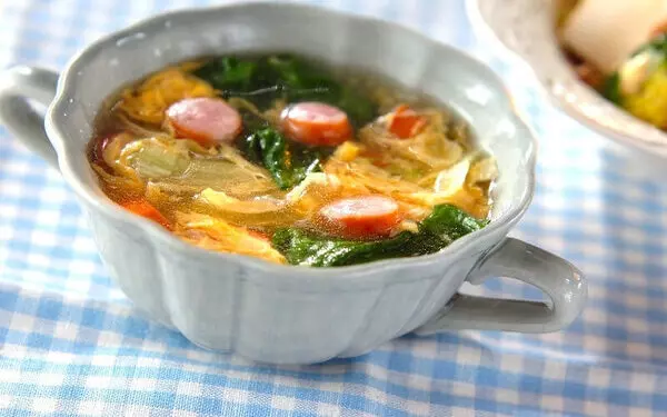 レタスが苦手、という子どもは卵やソーセージ入りのスープなら食べやすいですよ。コンソメベースのなじみのある味わいは、エビフライやピラフなど洋食の献立に合わせるのが◎です。