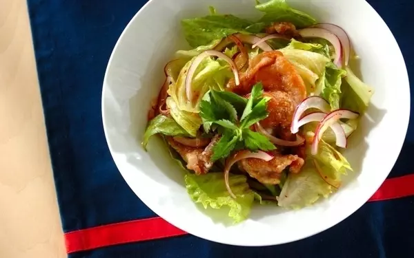 揚げた豚肉とレタスで作るおかずサラダです。豚ロース肉はしょうゆで下味をつけてから揚げるため、風味豊か。歯ざわりの良いレタスと紫玉ネギもよく合い、もりもり食べられますよ。スイートチリソースとポン酢しょうゆで作ったドレッシングをたっぷりかけて召し上がれ。
