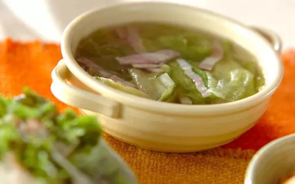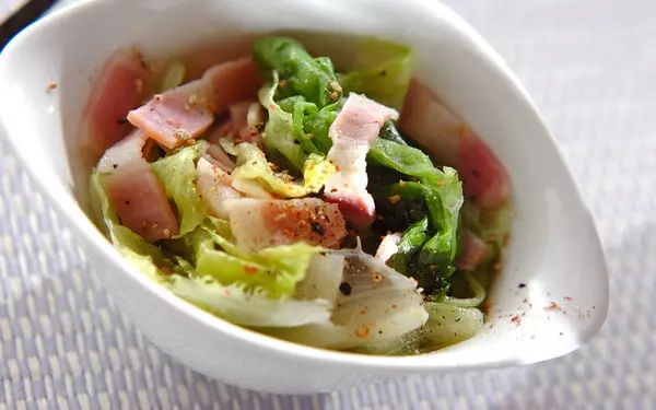 ベーコン入りのスープは旨みが凝縮された味わいが特徴です。レタスだけだと物足りなく感じる方も、これなら満足できそうですね。カット済のベーコンを使えば、包丁なしで作れます。粉チーズや黒こしょうをトッピングしても◎ですよ。