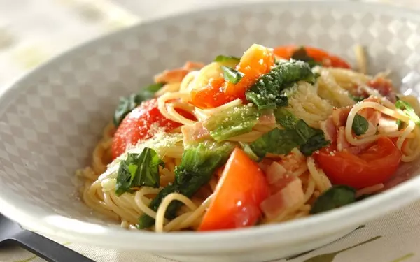 BLTサンドならぬ、BLTパスタは食べ応えも彩りも満点です。ベーコンを炒めて脂を引き出したら、トマトを加えましょう。茹で上がったスパゲティーとレタスを混ぜ合わせて完成です。ベーコンの脂と茹で汁が一体になるまでしっかり混ぜるとより美味に。