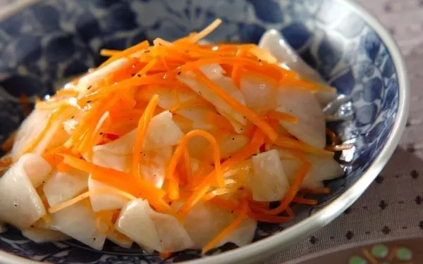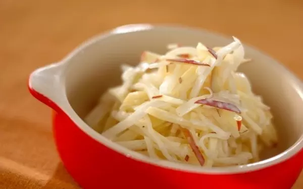 千切りにしたカブと、シャキシャキ食感のリンゴのコラボがたまらない一品。リンゴのやさしい甘さと酸味が調和し、飽きずに美味しく食べられます。さっぱりしているので、カレーや肉料理などの付け合わせにもおすすめです。