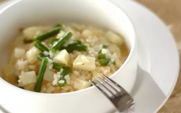 チーズを使わないリゾットはあっさりしていて、小腹が空いたときや夜食にもってこい。生のインゲンを使うと、冷凍よりも歯応えがしっかりしていますよ。生のお米を固形コンソメスープの素や水で煮て火を通します。お米がやわらかくなったらインゲンを加えてくださいね。