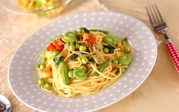インゲン・エンドウ豆・ソラ豆といった3種類の豆を使う、食感も見た目も楽しいパスタです。赤唐辛子やアンチョビで大人向けの味に調えたら、下茹でした豆を炒め合わせます。白ワインのおともにいかがでしょうか?