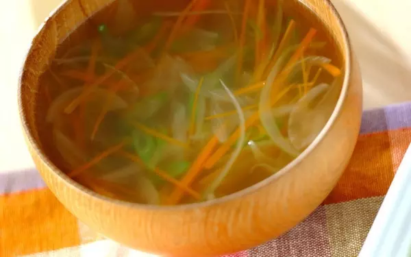 野菜たっぷりのスープは、から揚げやハンバーグなどお肉メインの献立に合わせるのがおすすめ。野菜は千切りにすると、短時間で火が通ります。インゲンは斜め薄切りにしましょう。野菜がしんなりしたら出来上がりです。