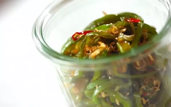 チリメンジャコを甘辛く煮た佃煮は、常備菜にあるとうれしいですね。ピーマンと一緒に炒めると食感が楽しめますよ。チリメンジャコがカリカリになったタイミングでピーマンを入れるのがポイントです。