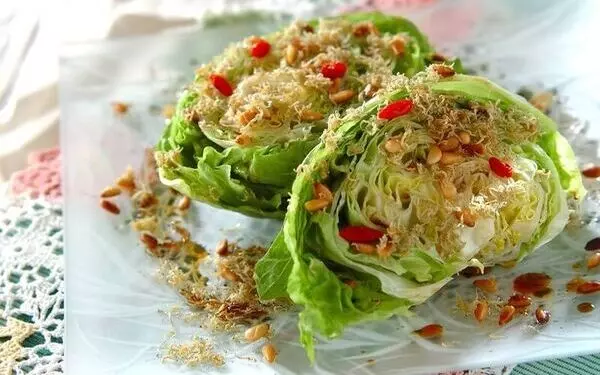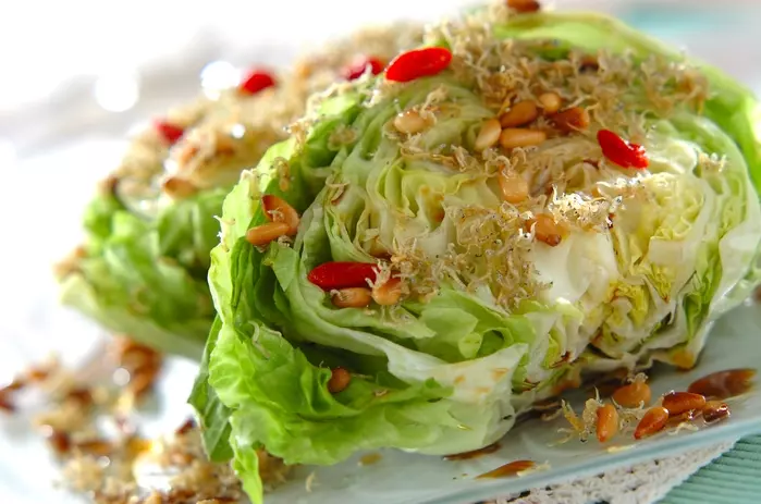 こちらは、ゴマ油を多めに使ってチリメンジャコと松の実を揚げるレシピ。ゴマ油を一緒にかけることで、レタスがほど良くしんなりしてたくさん食べられます。レタスを半分に切っただけの大胆な盛り付けは、おもてなしにも最適です。