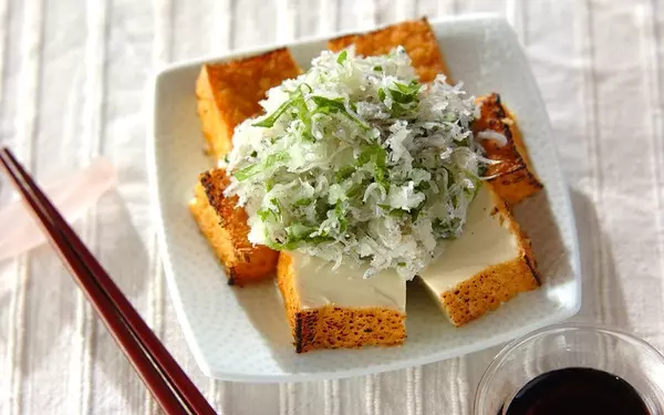 焼いた厚揚げに大根おろしをのせる、定番のおつまみ。そのままでも十分おいしいですが、大根おろしにチリメンジャコと大葉を混ぜると上品な味わいに。どちらもたっぷり加えるのがおいしさの秘訣です。