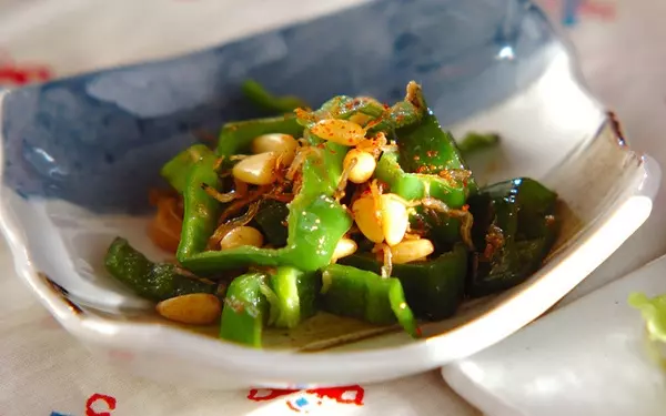 ピーマンとチリメンジャコの炒め物に、ニンニクや松の実でアクセントを加えます。風味の強い食材を使うので、ピーマンはやや太めに切ると存在感を楽しめますよ。松の実がないときは、クルミで代用しても良いでしょう。