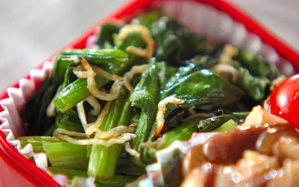 和食のイメージがあるチリメンジャコですが、バターとの相性も良いんです。ホウレン草のバターソテーに加えると、旨味たっぷりに仕上がります。チリメンジャコの旨味があるので、塩コショウは控えめで十分。コロッケやエビフライ弁当のおかずにいかがでしょうか?