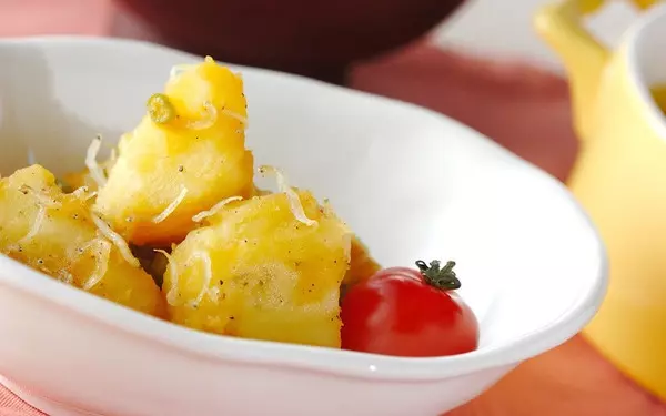 粉ふきイモに炒めたチリメンジャコを加えた、ユニークなサラダです。味付けに甘酢を使うため、カルシウムの吸収率が上がるのもうれしいポイント。ほくほくのジャガイモにチリメンジャコの食感が楽しく、魚が苦手な子どもにも喜ばれますよ。