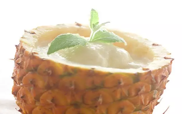 1、ミキサーにオレンジジュース、パイナップルを入れてかくはんし、冷蔵庫で冷やす。グラスに分け入れ、ジンジャーエールを注ぎ入れ、セルフィーユを飾る。