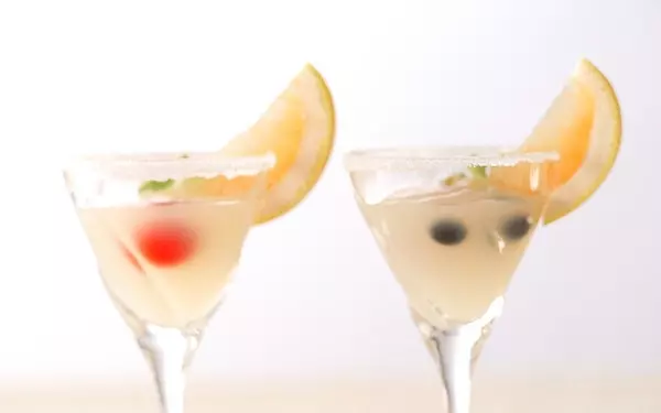 お酒好きの方には、ウォッカベースのカクテルがイチオシです。グレープフルーツ果汁はレモン汁や砂糖などと一緒に混ぜ合わせ、粉寒天でゆるくとろみをつけます。グラスに浮かんだブルーベリーやプチトマトの色が映えてとてもキレイですよ。
