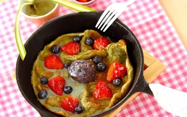 オーブンで焼き上げるのが特徴のダッチベイビー。強力粉と抹茶で生地を作るため、もっちり仕上がりますよ。焼き上がったら粒あんとイチゴ、ブルーベリーをトッピングして出来上がり。キュートな見た目で大人にも子どもにも喜ばれます。