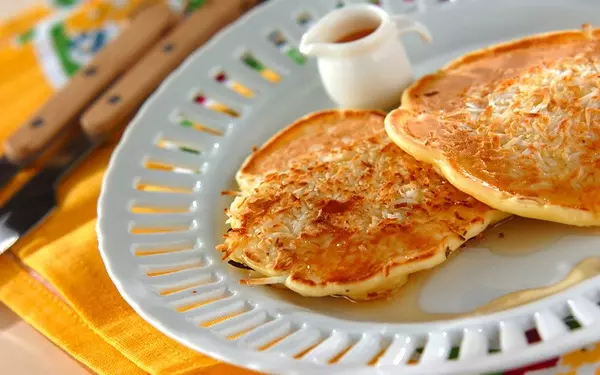ココナッツミルクやバナナを混ぜ込んだパンケーキはトロピカルな味わい。芳醇な香りが魅力で、リッチなパンケーキを楽しみたい方におすすめです。バナナは熟したものを使うとよりおいしさが増しますよ。