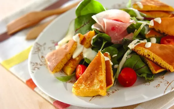 食欲が落ちがちな夏こそ、しっかり食べたいですね。シンプルなパンケーキとベビーリーフや生ハム、プチトマトなどを盛りつけ、サラダ感覚でいただきましょう。パンケーキは小さめに切ると野菜や生ハムとのバランスが良いですよ。