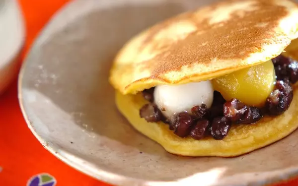 秋に食べたくなる食材のひとつが「栗」。小さく焼いたパンケーキで栗の甘露煮をサンドすると、どら焼き風になりますよ。もっちりとした白玉団子や粒あんの甘さが絶妙で、ついつい手が伸びます。