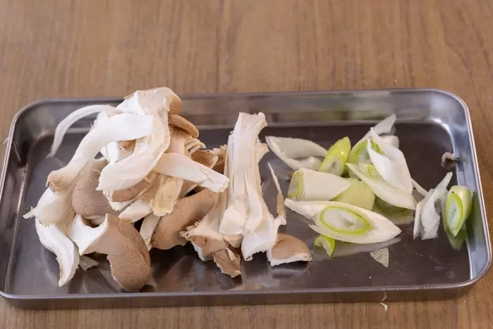 1、エリンギは食べやすい大きさに切る。白ネギは斜め切りにする。