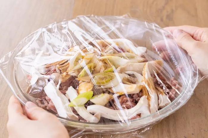 3、ふんわりラップをしてレンジで600Wで6分加熱する。